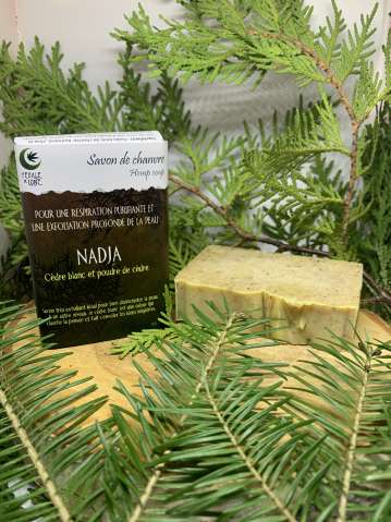 Coposition : huiles biologiques de chanvre, tournesol, canola et noix de coco, cire d’abeille biologique, eau de source, hydroxide de sodium, huile essentielle de cèdre blanc, sciure de cèdre blanc.